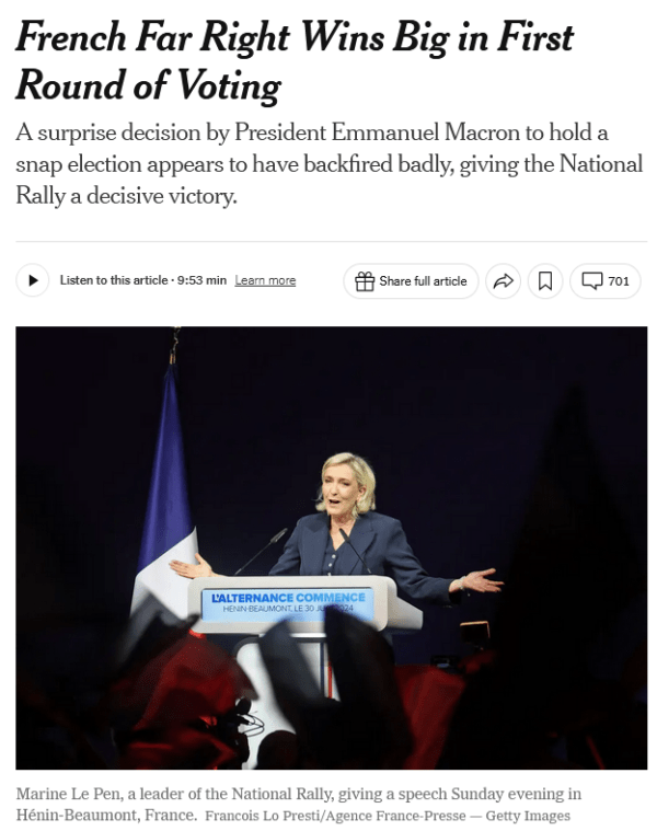 It’s not that the Times didn’t think the French elections were worth reporting on; the paper ran five news articles (6/30/24, 6/30/24, 7/1/24, 7/1/24, 7/7/24), including two on the front page of its print edition, from June 30–July 7 on “France’s high-stakes election” that “could put the country on a new course” (6/30/24). But as it became clear that Macron was not going to name a prime minister, transforming the snap election into a constitutional crisis, the US paper of record seemingly lost interest.