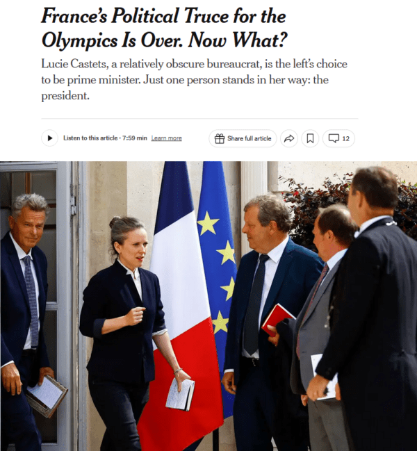 She went on to admit, however, that Castets, the NFP’s choice for prime minister, “has softened her position from its original hard-core stance”—that is, that the coalition would implement the program it ran on—and that “she says she would pursue something more reflective of minority government position.”