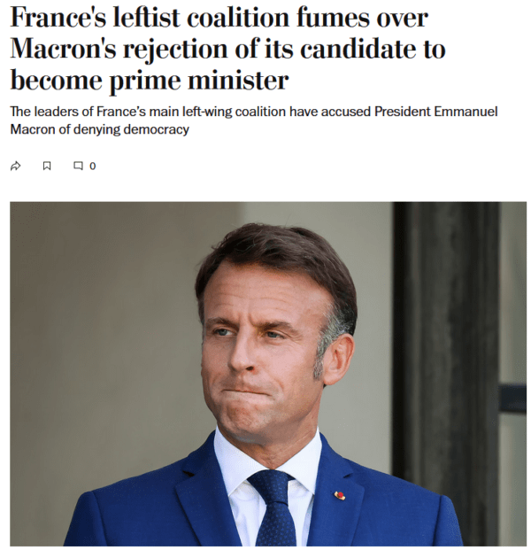 AP left out of its story the fact that Jean-Luc Mélenchon, the leader of France Unbowed (LFI), the supposedly most objectionable member of the NFP coalition, even offered to accept an NFP government led by Castets, with no LFI members in ministerial roles, to assuage the fears of centrists. This olive branch did not impress AP, which instead relayed Macron’s call for “left-wing leaders to seek cooperation with parties outside their coalition.”
