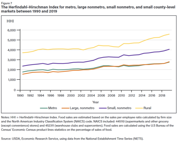 The USDA Economic Research Service has found that between 1990 and 2019, retail food industry concentration has increased, and the industry is at a level of “high concentration” in most counties. Consumers in rural and small non-metro counties are most vulnerable to noncompetitive market conditions.