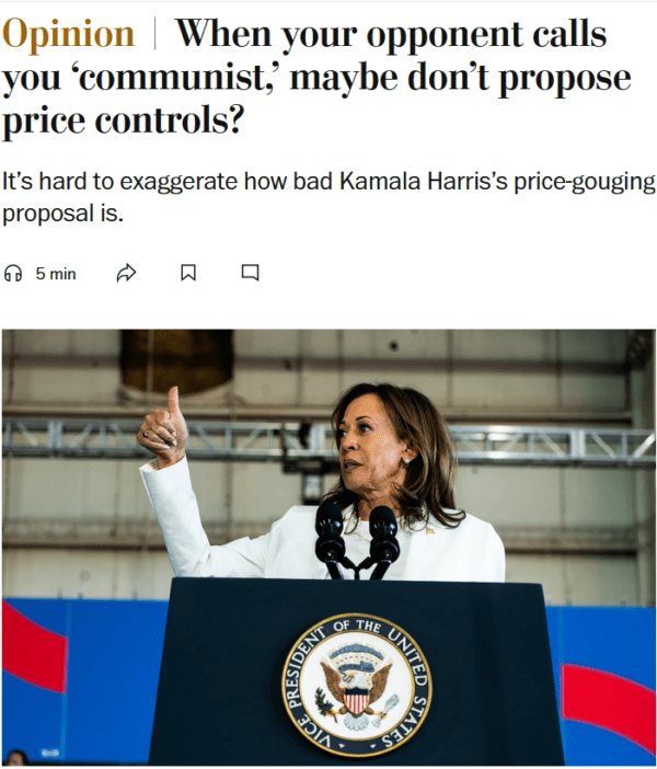 What’s perhaps more concerning is centrist or purportedly liberal opinion pages’ acceptance of Harris’s proposal as outright price controls. Catherine Rampell, writing in the Washington Post (8/15/24), claimed anti-price-gouging legislation is “a sweeping set of government-enforced price controls across every industry, not only food…. At best, this would lead to shortages, black markets and hoarding.” Rampell didn’t go as far as to call Harris a Communist outright, but coyly concluded: “If your opponent claims you’re a ‘Communist,’ maybe don’t start with an economic agenda that can (accurately) be labeled as federal price controls.”