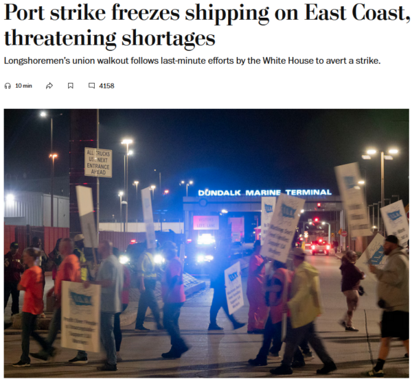 The economic effects of the strike have been much-bandied. The cost to the US economy, depending on your source, could amount to $3.78 billion per week (Washington Post, 10/1/24), $4.5 billion to $7.5 billion per week (New York Times, 10/1/24) or a whopping $5 billion per day, according to the brain trust at J.P. Morgan (New York Times, 9/30/24).